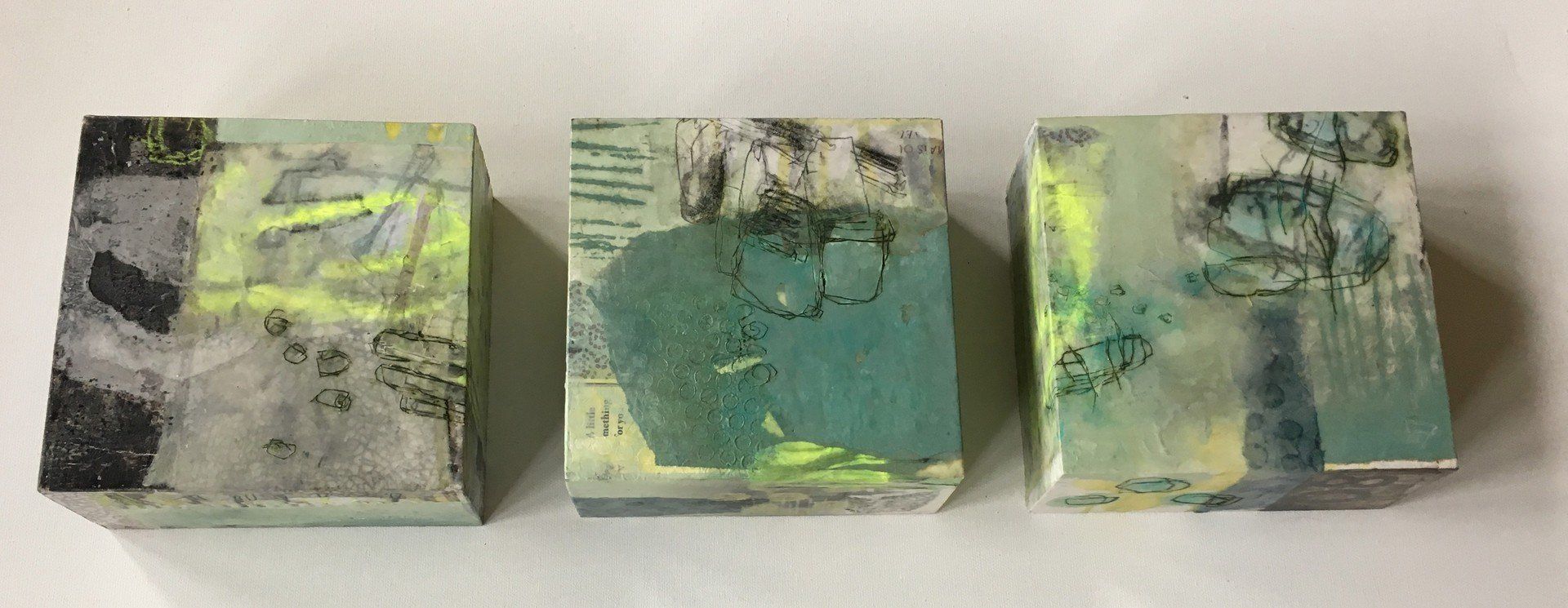 Unterwasserwelt Acryl/Mischtechnik unter Wachs auf Holzkörper 2016 3er Gruppe, je 20x20x9cm