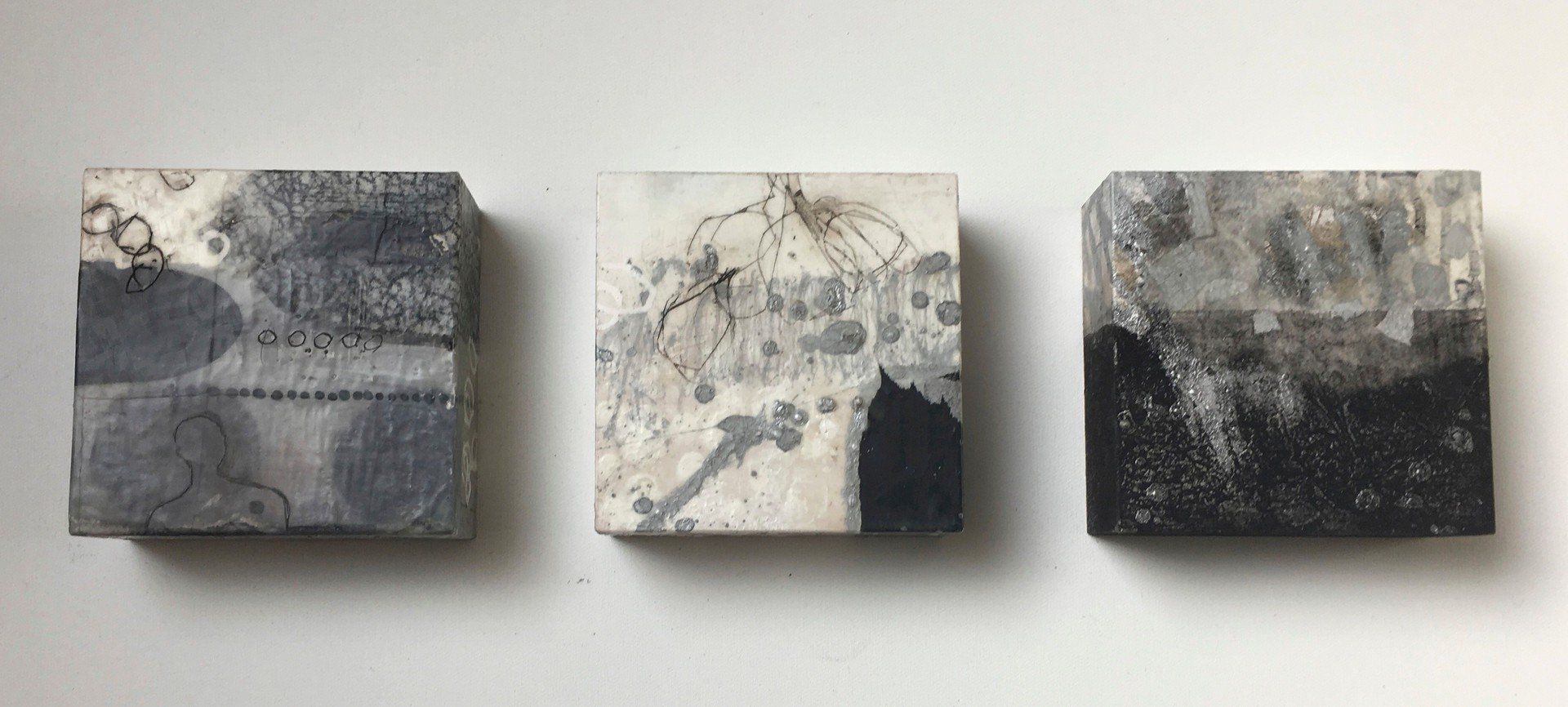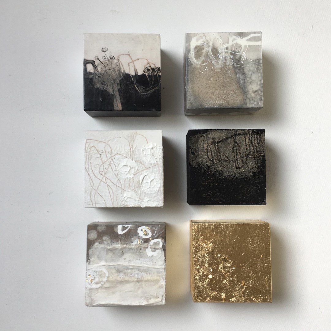 3er Gruppe Acryl/Mischtechnik auf Holzkörper 2016, je 15x15x6cm